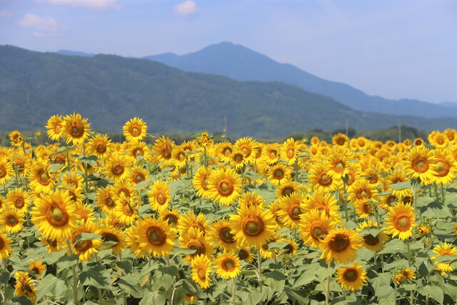 吉野川市と阿波市の間に流れる吉野川中流の善入寺島でヒマワリが綺麗に咲いています。一面に広がる黄色の絨毯と青空のコントラストは初夏の訪れを感じさせてくれます。(撮影日:令和7年7月7日) |