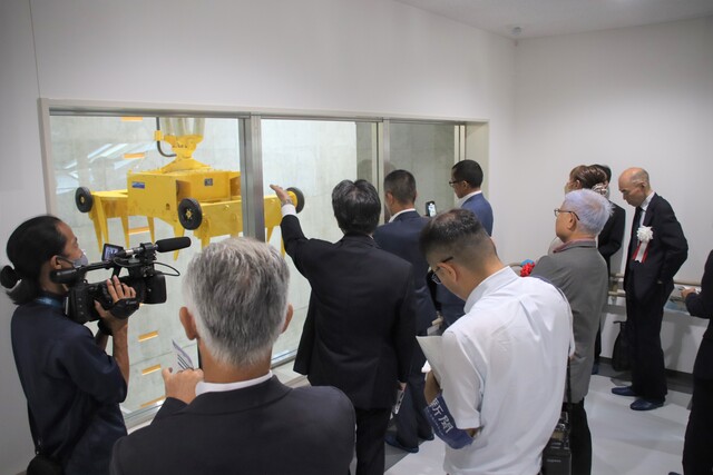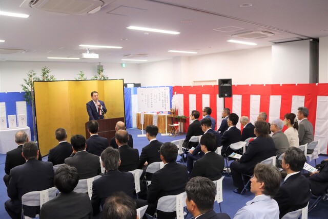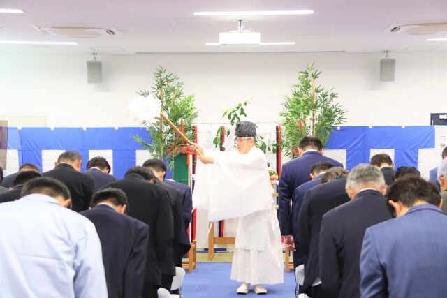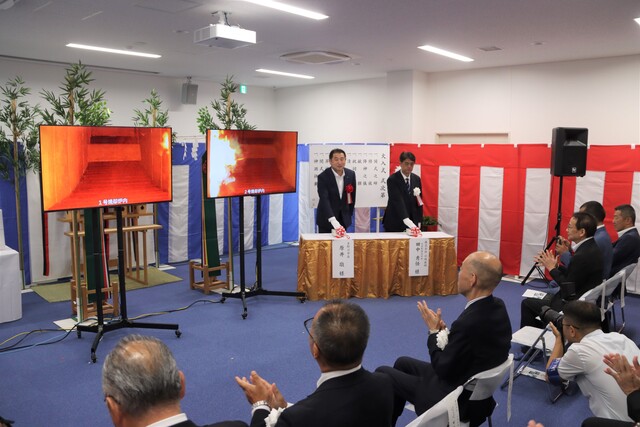 7月18日、今年11月1日に稼働予定の吉野川市新ごみ処理施設で、「火入式」が厳かに行われ、市長をはじめとする関係者約70人が出席しました。焼却炉へ実際に火を入れる『火入れ之儀』では、施主と設計施工者により点火スイッチが押され、赤々と燃える焼却炉の様子がモニターに映し出されるなど、新ごみ処理施設の安全祈願を行いました。 |