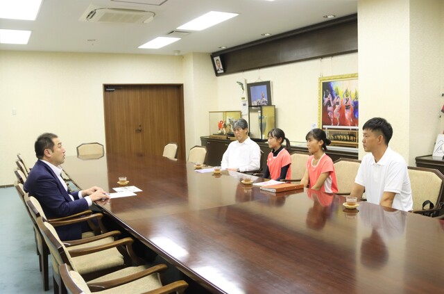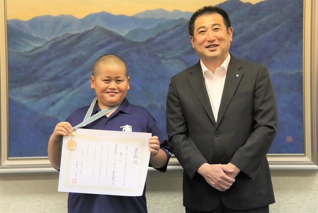 7月23日、名西Jr.相撲倶楽部に通う新居理恩さん(飯尾敷地 小5年生)が市役所を訪れ、8月10日に東京のひがしんアリーナ(墨田区総合体育館)にて開催される「第40回わんぱく相撲全国大会」に出場する旨を市長へ報告しました。新居さんからは「入賞を目指して頑張ります」とに向けての意気込みが語られました。 |