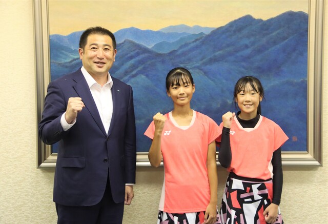 7月18日、鴨島ソフトテニスクラブジュニア部に所属している伊丹栞奈さんと中林結香さんが市役所に訪れ、全日本小学生選手権に出場する旨を市長に報告しました。選手らからは「ペアと協力し合って全国大会で一勝できるように頑張ります」と大会に向けて意気込みが語られました。 |