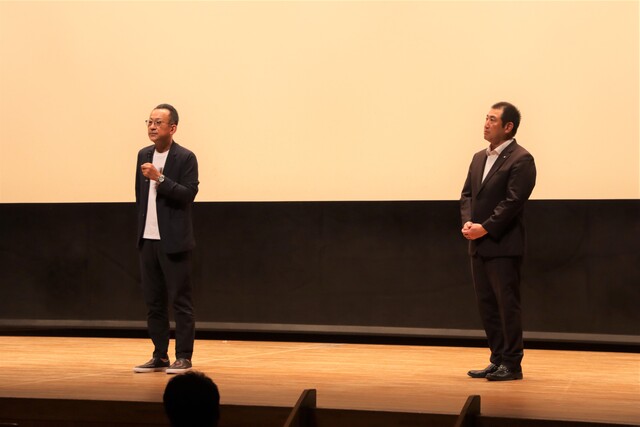 7月27日、吉野川市アメニティセンターと鴨島公民館で、吉野川市市制20周年及び板野町町制70周年を記念した共同制作映画「道草キッチン」の吉野川市民向け試写会が行われました。上映前には、本映画の監督である白羽弥仁さんから、来場者に向けてご挨拶いただきました。 |