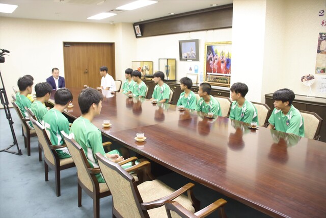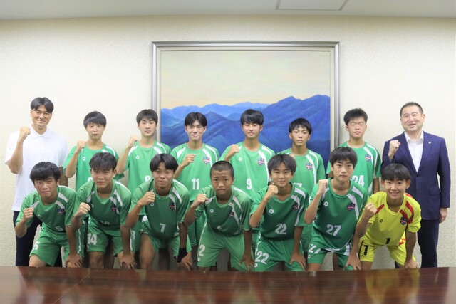 8月8日、吉野川市を拠点に活動するサッカーチーム「吉野川SCJr.ユース」の選手らが市役所に訪れ、『第56回全国中学校サッカー大会』に出場する旨を市長に報告しました。市長からは「チーム一丸となって頑張ってほしい」と全国大会での活躍を期待する激励の言葉が贈られました。 |