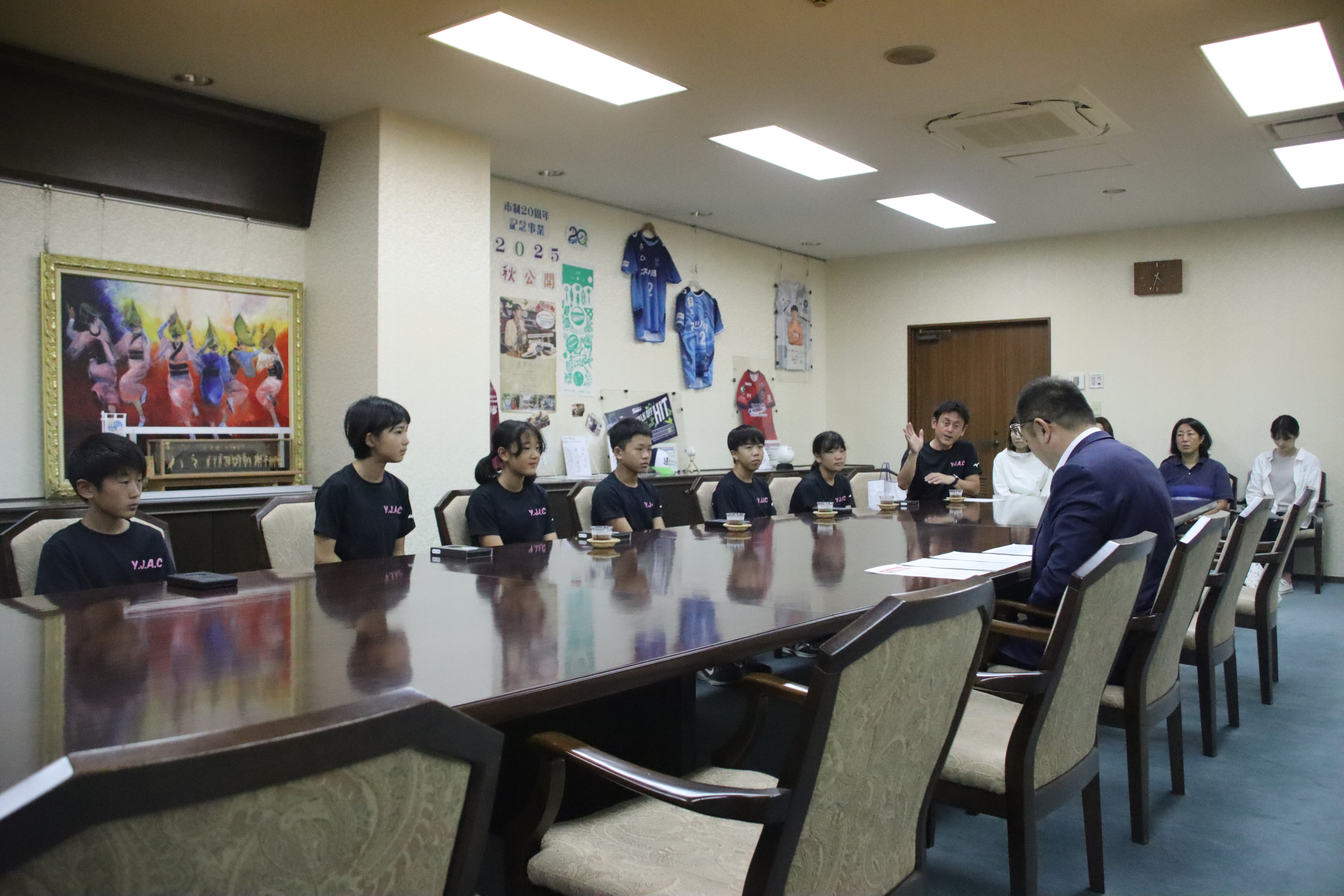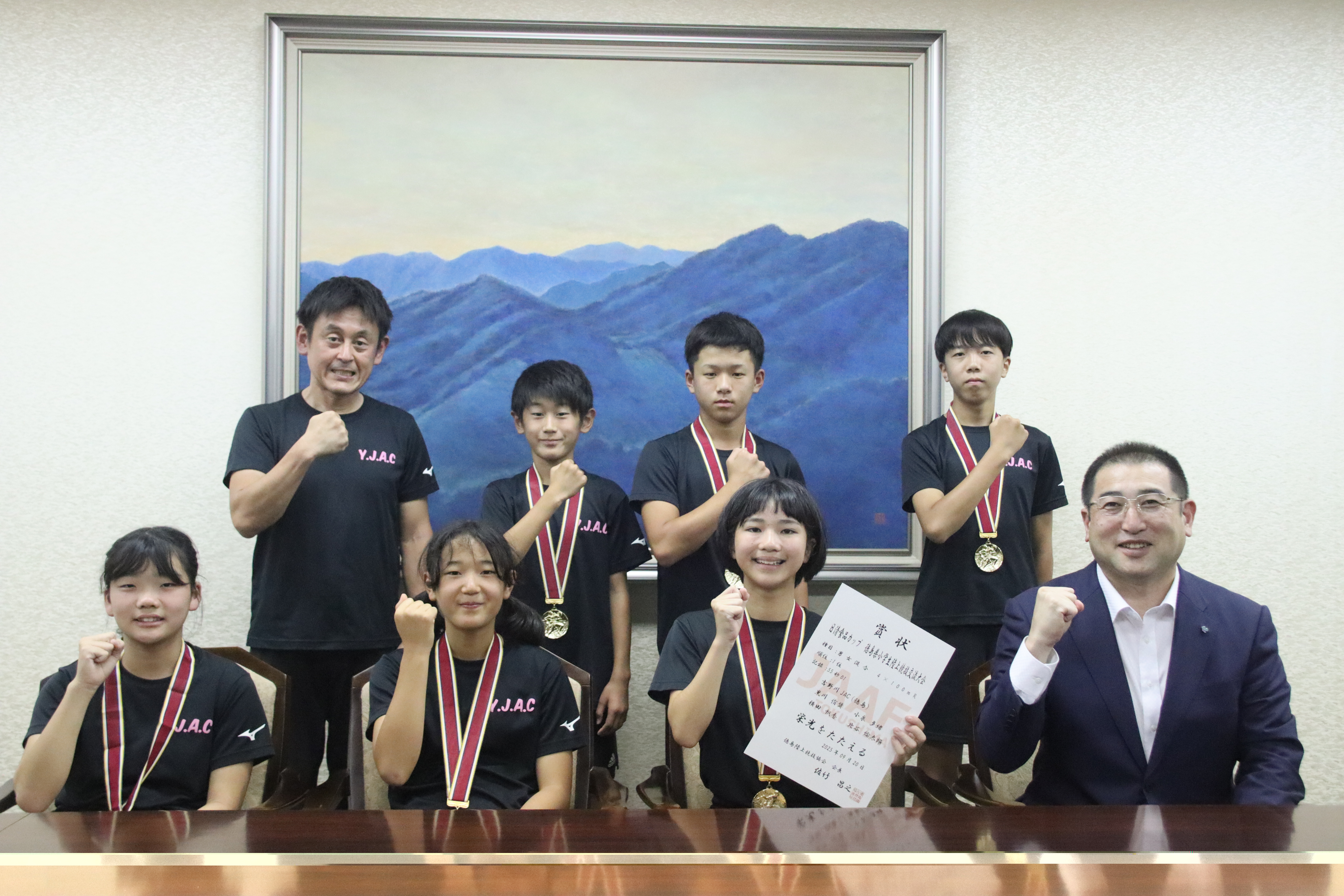 | 10月3日、吉野川市を拠点に活動するジュニアアスリートクラブ「吉野川JAC」の選手らが市役所に訪れ、『日新食品カップ全国小学生陸上』に出場する旨を市長に報告しました。市長からは「チーム一丸となって頑張ってほしい」と全国大会での活躍を期待する激励の言葉が贈られました。 |