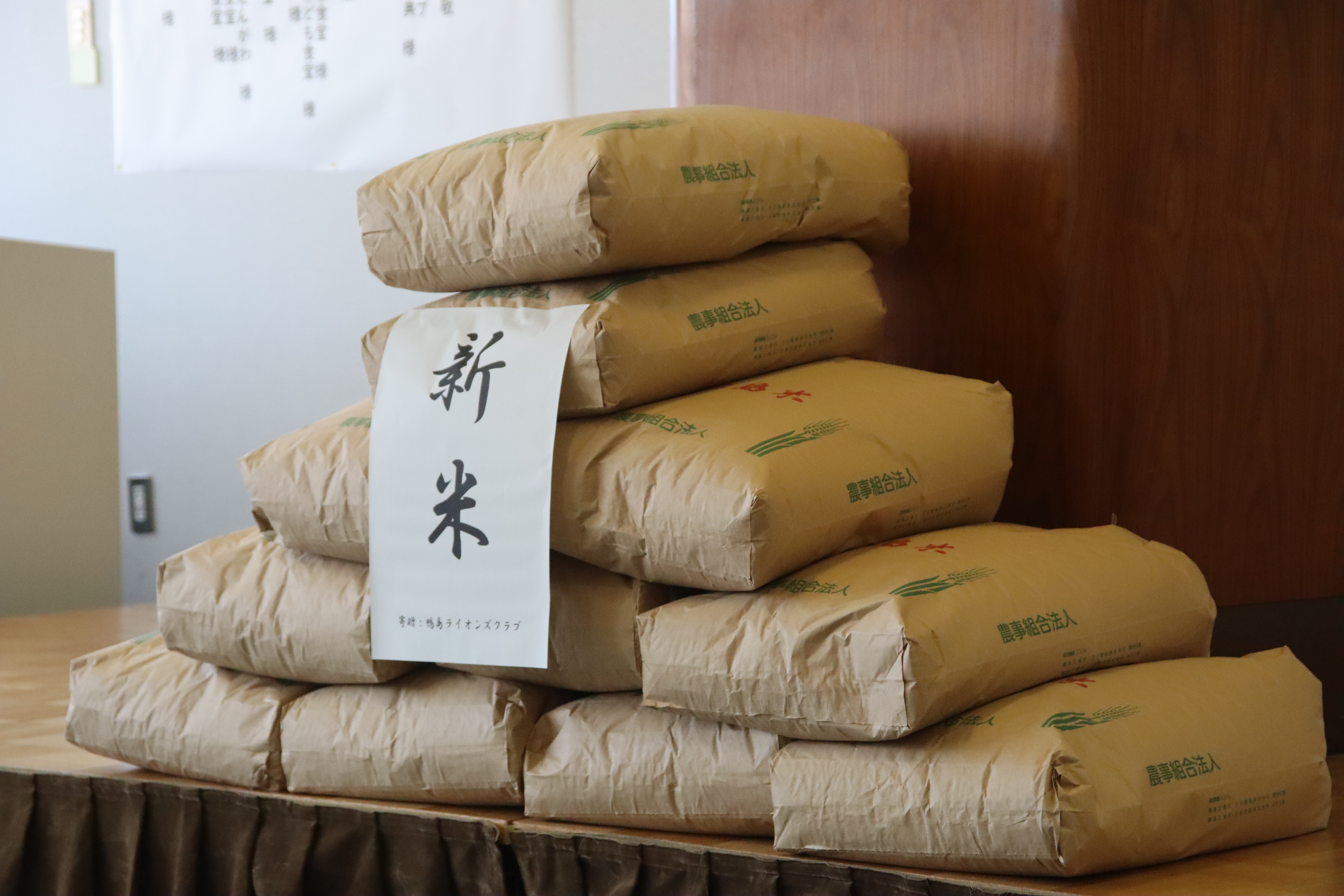 | 10月6日、市役所にて「こども食堂への新米寄贈式」が行われました。鴨島ライオンズクラブ原田和典会長から市内11団体のこども食堂へ採れたての新米1俵と目録が手渡されました。団体を代表して川島えがお食堂の明石眞和代表が「地域のこどもたちの健やかな成長を願い、これからも食事を提供していきます」とお礼の言葉を述べられました。寄贈された新米は、それぞれのこども食堂でふるまわれます。 |