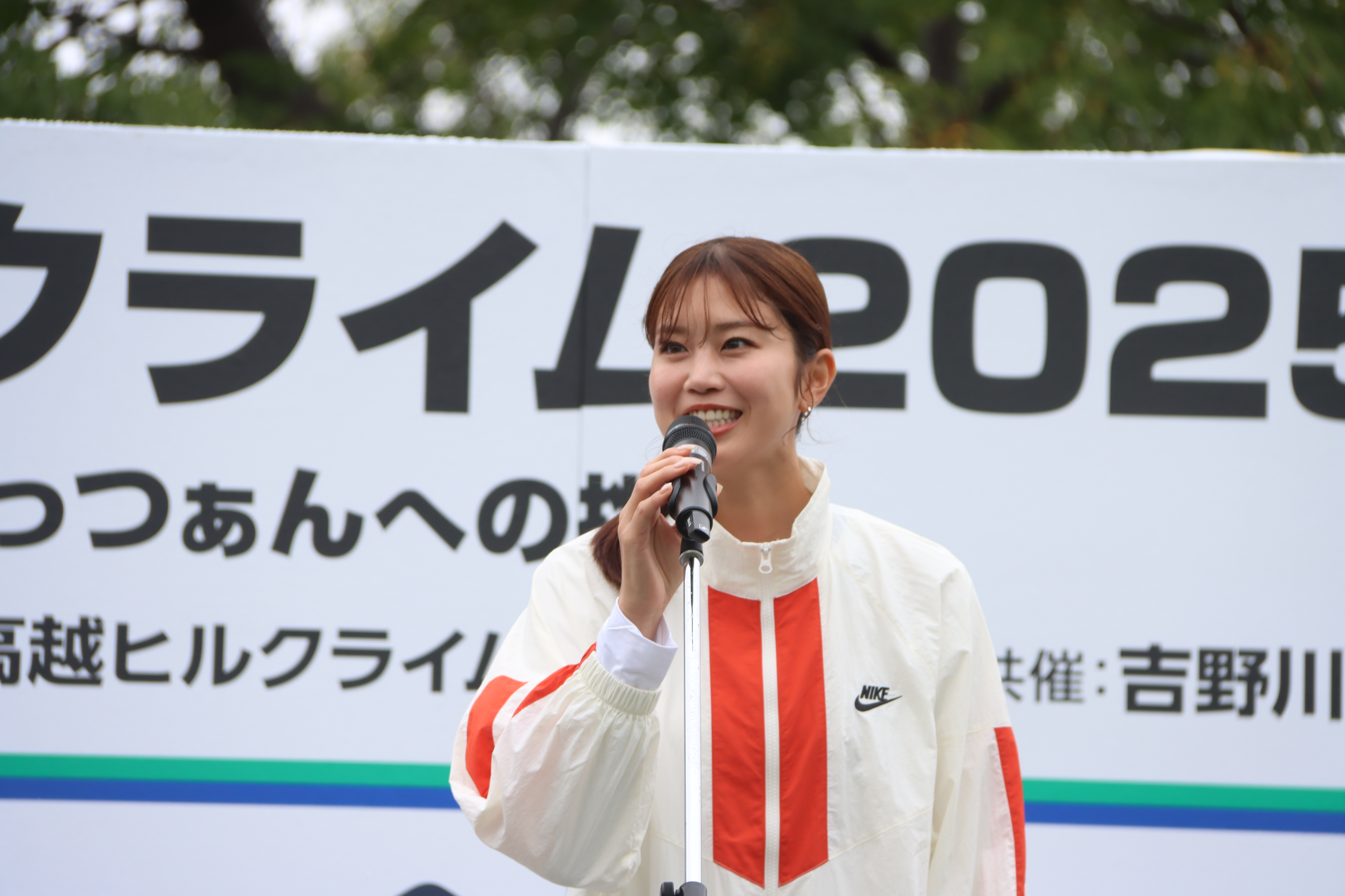 | 10月26日、本市で初となる高越山を舞台とした自転車登坂競技(ヒルクライムレース)が開催されました。大会には、県内外から多くの選手が参加し、13.2kmのコースに挑みました。また、国土交通省自転車アンバサダーの稲村亜美さんをゲストとして招き、メイン会場にてイベントを開催するなど、大会を大いに盛り上げました。 |