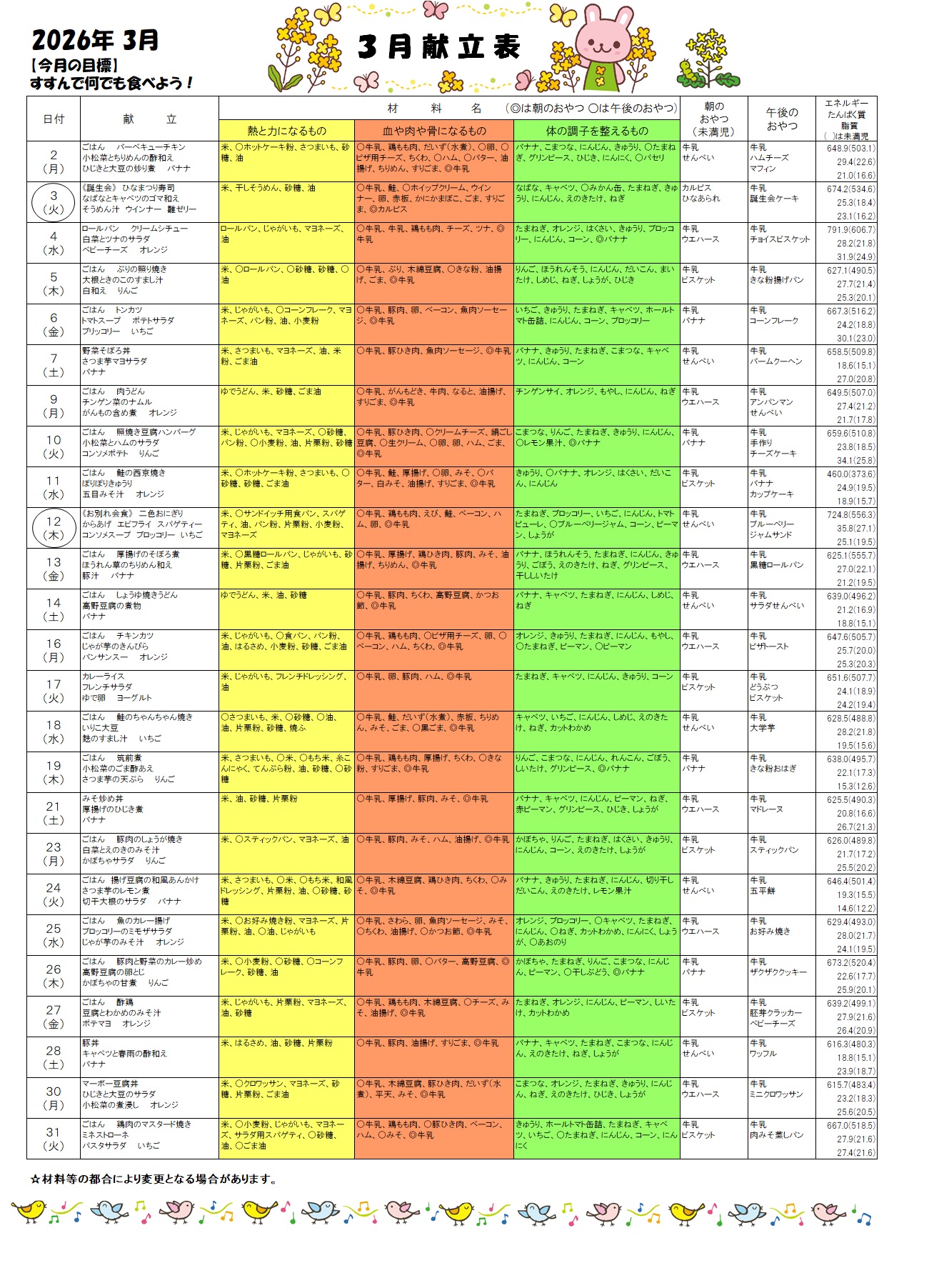 公開日 2026年03月01日 吉野川市公立認定こども園給食献立表(2026年3月) ※施設により、行事等の都合で献立の内容が変更または前後する場合があります。 関連ワード こども園 給食 献立 お問い合わせ 健康福祉部 こども未来局 こども未来課TEL:0883-22-2266FAX:0883-22-2245E-Mail:kosodate@yoshinogawa.i-tokushima.jp