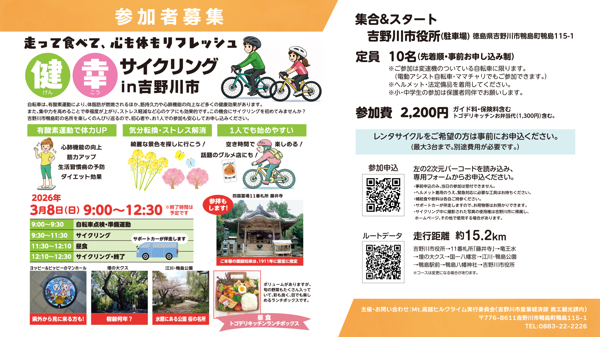 公開日 2026年02月17日 健幸サイクリングin吉野川市は、自転車で吉野川市鴨島町の名所を楽しく、のんびり巡るイベントです。 自転車で健康づくりを楽しみながら、鴨島町の魅力に触れてみませんか? 初心者の方や、お一人での参加も大歓迎です! 是非この機会にお申し込みください。 ※お申し込みは下記チラシのQRコードよりお願いいたします。