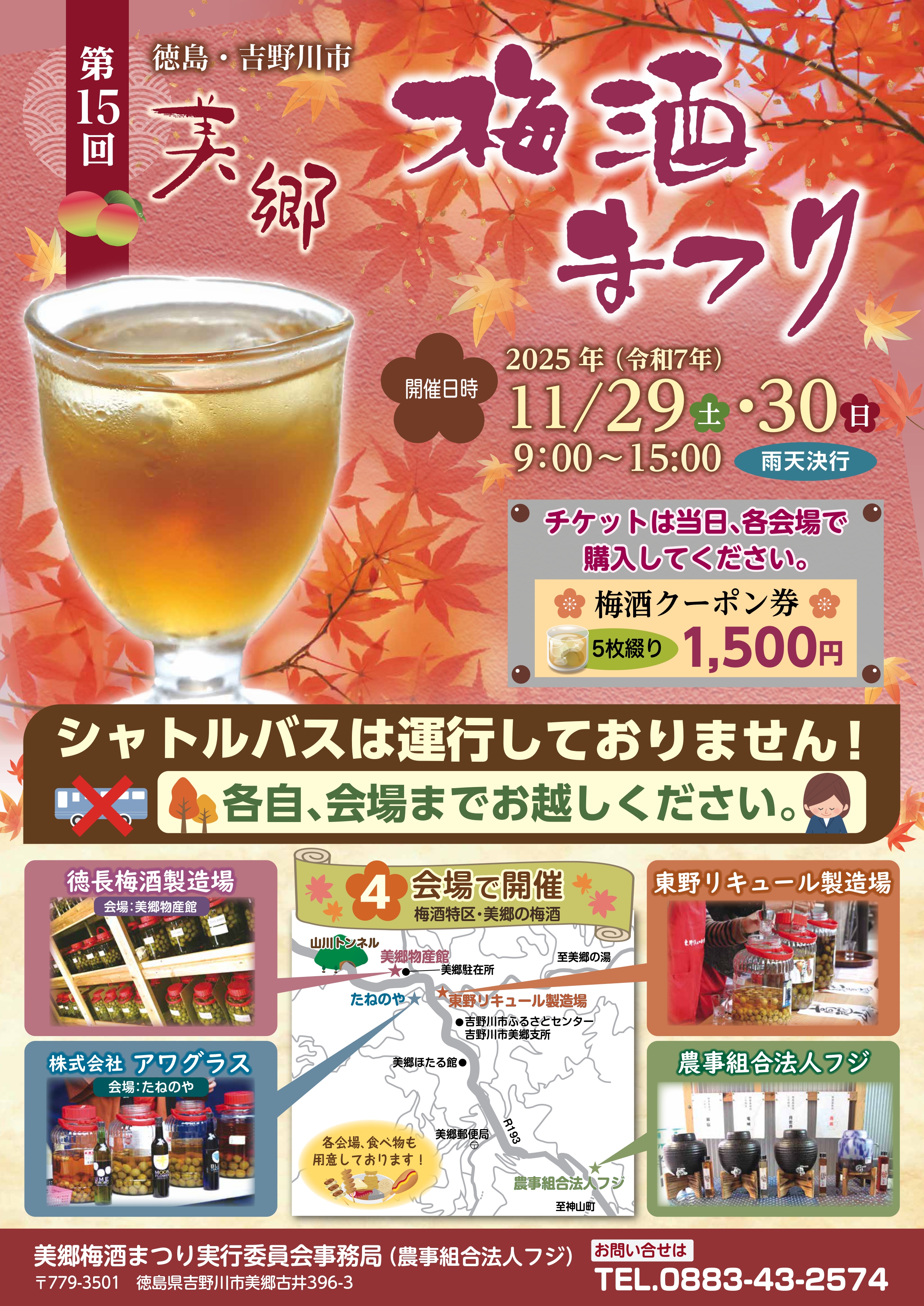 ![]()  | 2024年11月23日(土)~2024年11月24日(日)  | 第15回美郷梅酒まつりの開催について | |